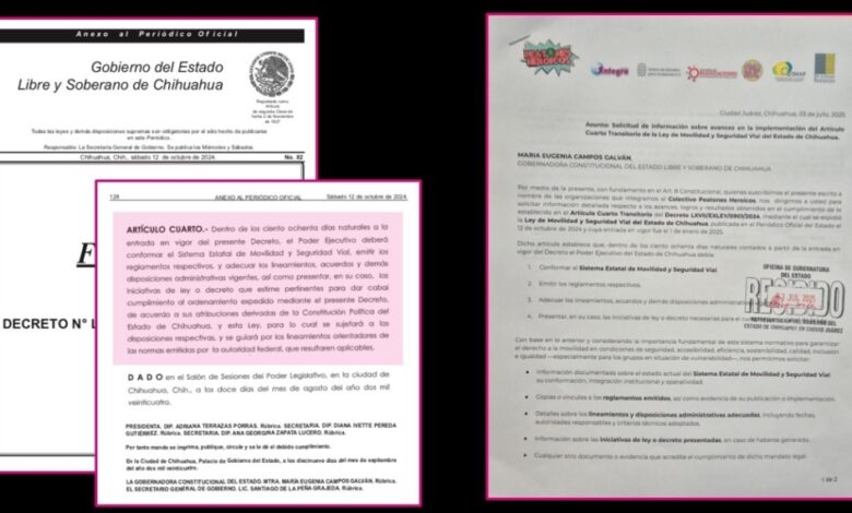 El Colectivo Peatones Heroicos solicitó a la gobernadora María Eugenia Campos Galván información detallada sobre los avances en la implementación del Artículo Cuarto Transitorio de la Ley de Movilidad y Seguridad Vial del Estado de Chihuahua.